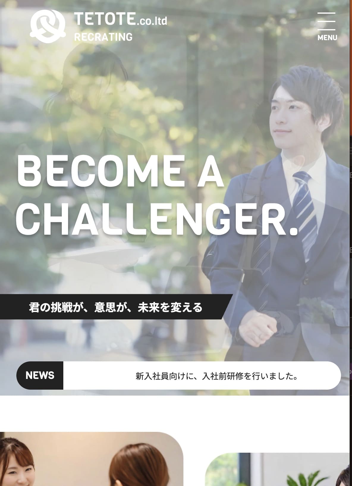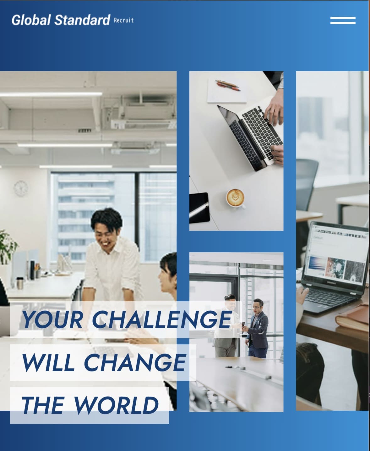 グローバル教育企業の採用サイト制作。研修職種紹介やキャリアパスを整理し、ユーザーに選考意欲を高める構成とレスポンシブ実装を行いました。